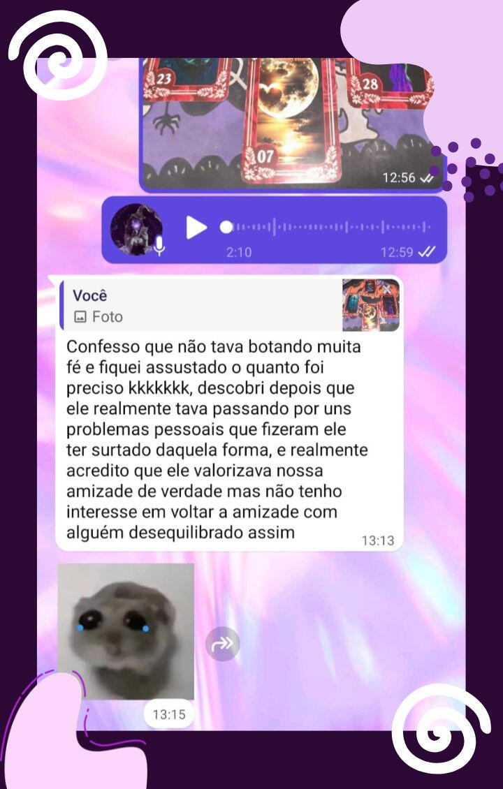 NÃO tiro sobre MORTE, DESAPARECIMENTO E SAÚDE.atendimento de segunda a sábado. das 7:00 às 22:00 horas, por ordem de chegada!feitiços personalizados ou fora de catálogo terão um valor diferente.atendimento apenas para Maiores de 18 ANOS.OBS: é obrigatório uma tiragem antes de cada feitiço para confirmação, o valor será acrescentado no valor final do trabalho.